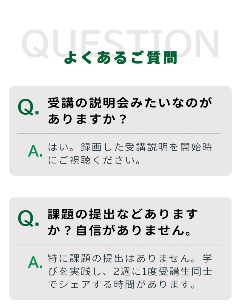 買い切り価格で受講の方は、受講が終わってもずっとコミュニティに残って受講中や過去の受講生やファシリテーターと交流を持つことが可能です。月額で受講の方は、お支払いがない月にコミュニティに残ることができませんのでご注意ください。