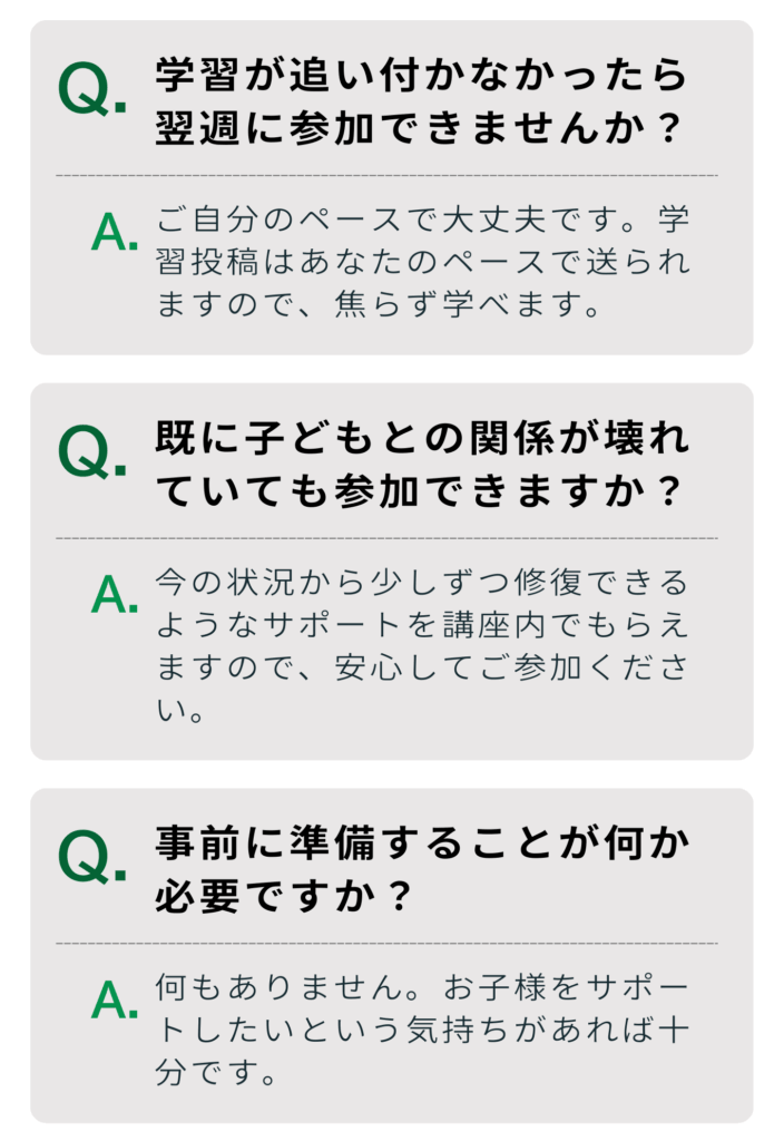 一人ではなくて、一緒に学べてとってもよかったです。特に2年前から学校に行っていない娘に加えて、ちょうどこの講座を受けている最中に、長男が行きたくないと言い始めたり、転校したばかりの次男も行きたくないという日があったりしていたので、まさに必要なタイミングで受講でき、本当に助けになりました。これを受けていなかったら受け入れられなくて子供も私も大変だったと思います。
