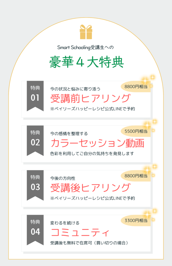 さらに、公式LINEに登録してお申し込みいただくと、下記の豪華特典がついてくるので、受講する際は特典をもらえるように公式LINEの友達追加をしてそこからお申し込みくださいね🎁